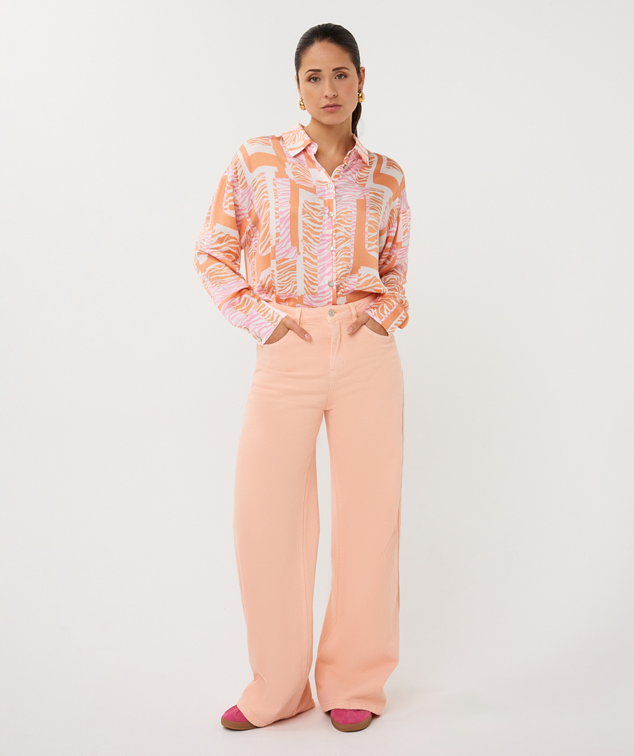 Soepelvallende doorknoopblouse in onze kleurrijke Divine Blocks print. De blouse heeft een lichte glans en is gemaakt van 55% viscose en 45% rayon.