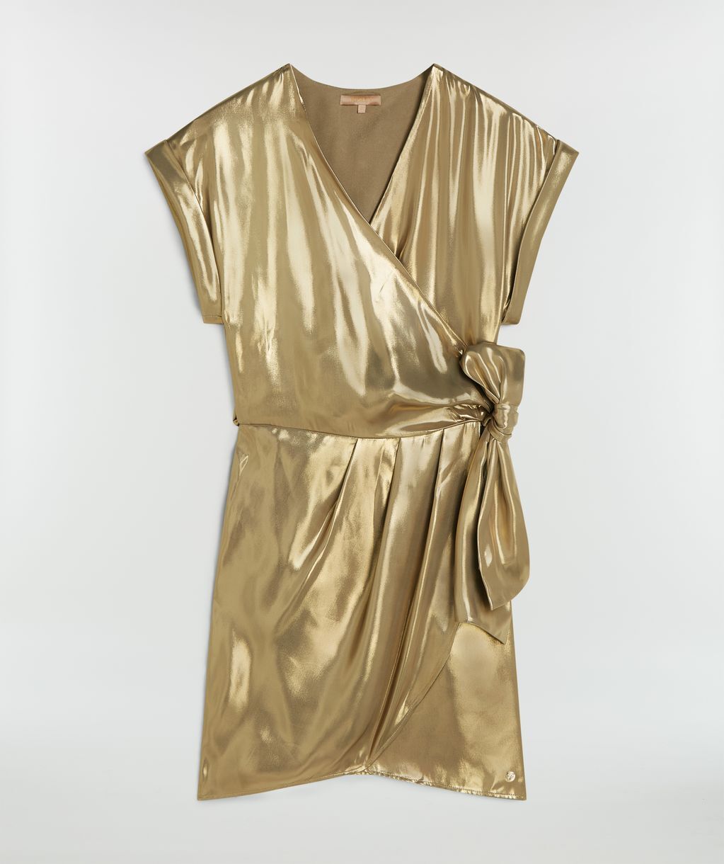 Op zoek naar een unieke en opvallende jurk voor de zomer? De JOSH V Dya damesjurk in de kleur Gold is gemaakt van een prachtige glanzende, metallic stof. De overslagjurk heeft opgerolde mouwen en sluit door middel van een striksluiting. Het gouden, metallic jurkje heeft verder een regular pasvorm. Dit gouden overslagjurkje leent zich perfect voor een wedding party of andere feestelijke gelegenheid.