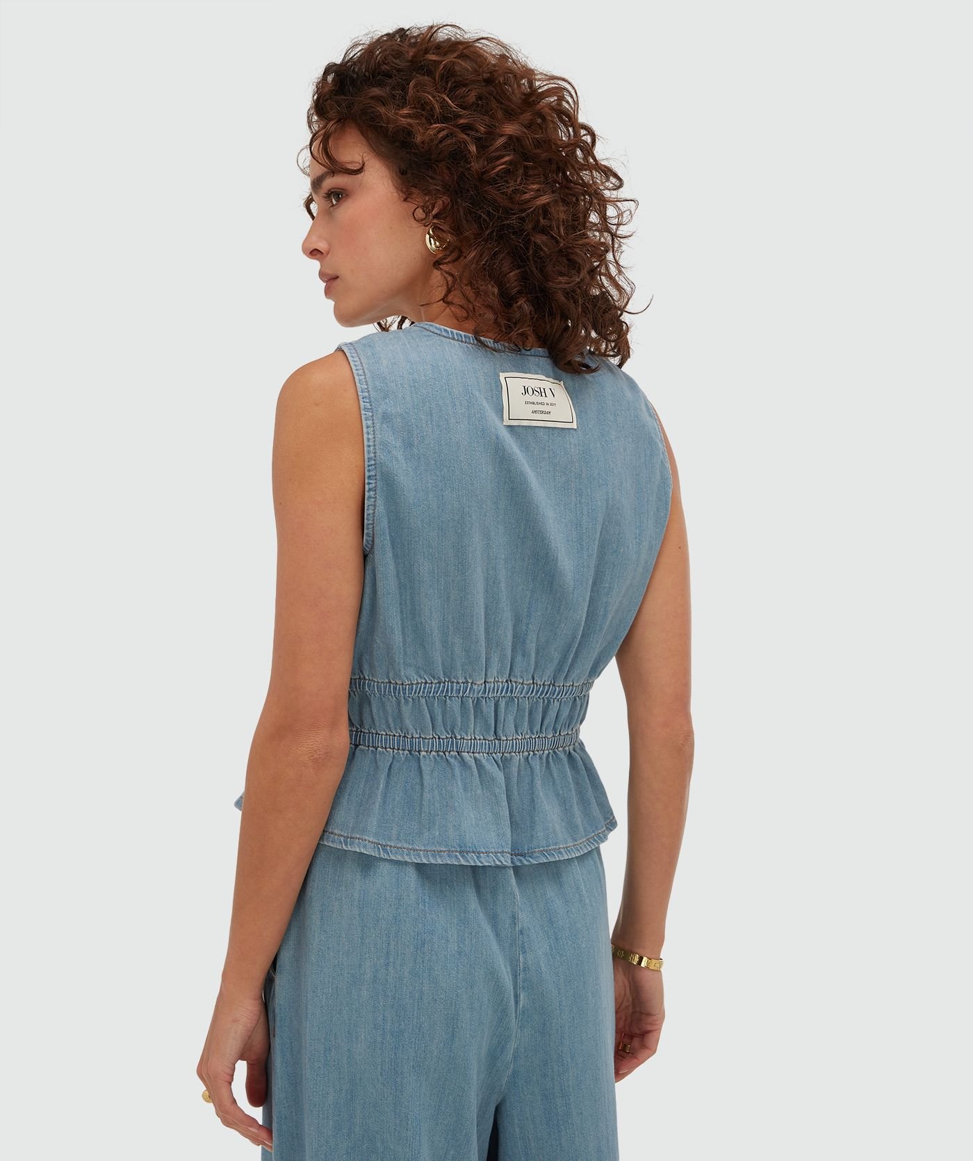 Josh V Sea Gilet in Mid Blue Denim De JOSH V Sea dames top in de kleur Mid Blue Denim is een getailleerde denim top, gemaakt van katoen ingekocht via het Better Cotton Initiative (BCI™). Het denim gilet is voorzien van twee treksluitingen waarmee je taille creëert. De blauwe top is onderdeel van een compleet pak en combineer je perfect met de Sera broek, maar ook draag je de top perfect in combinatie met een witte broek.
