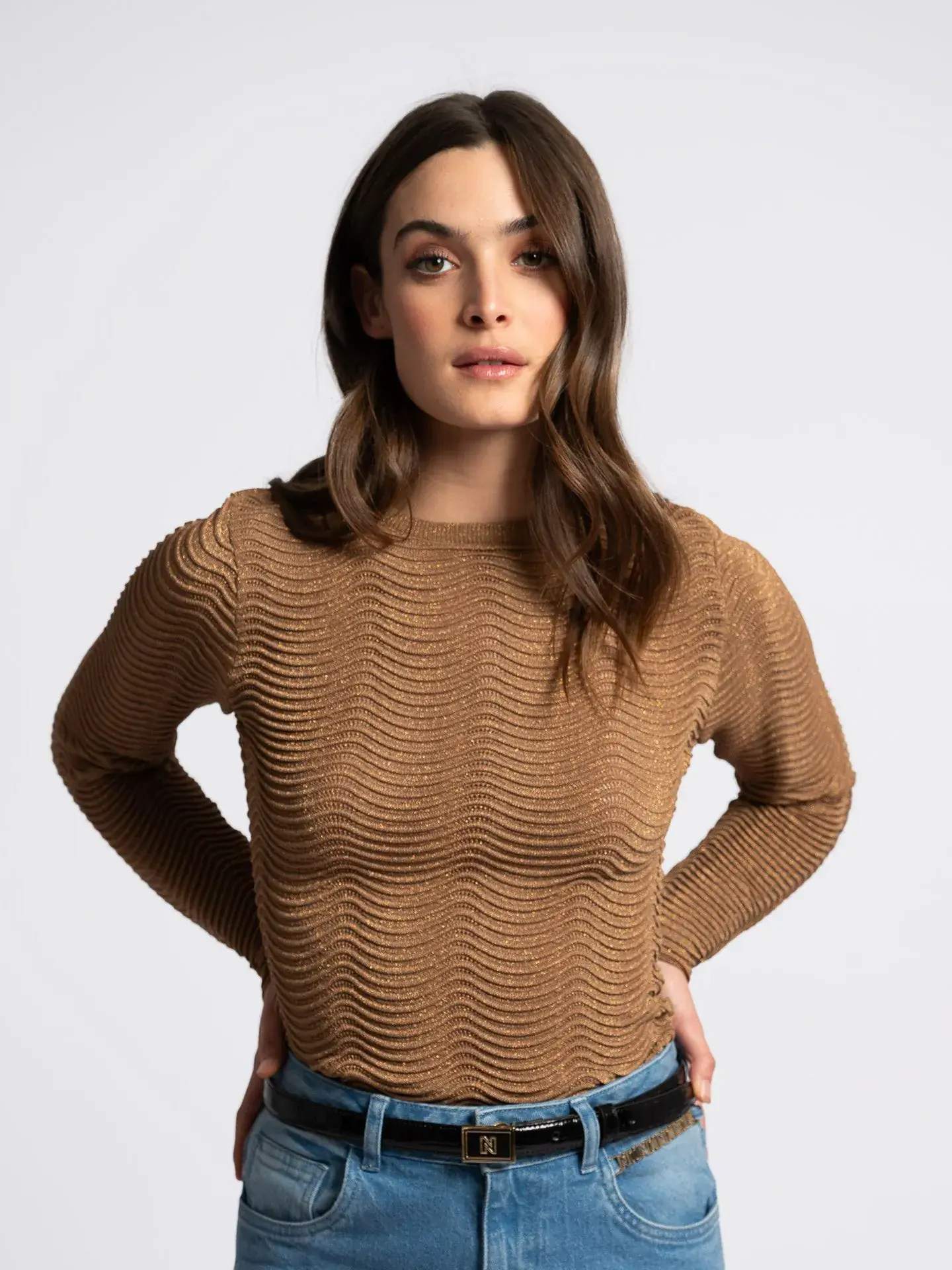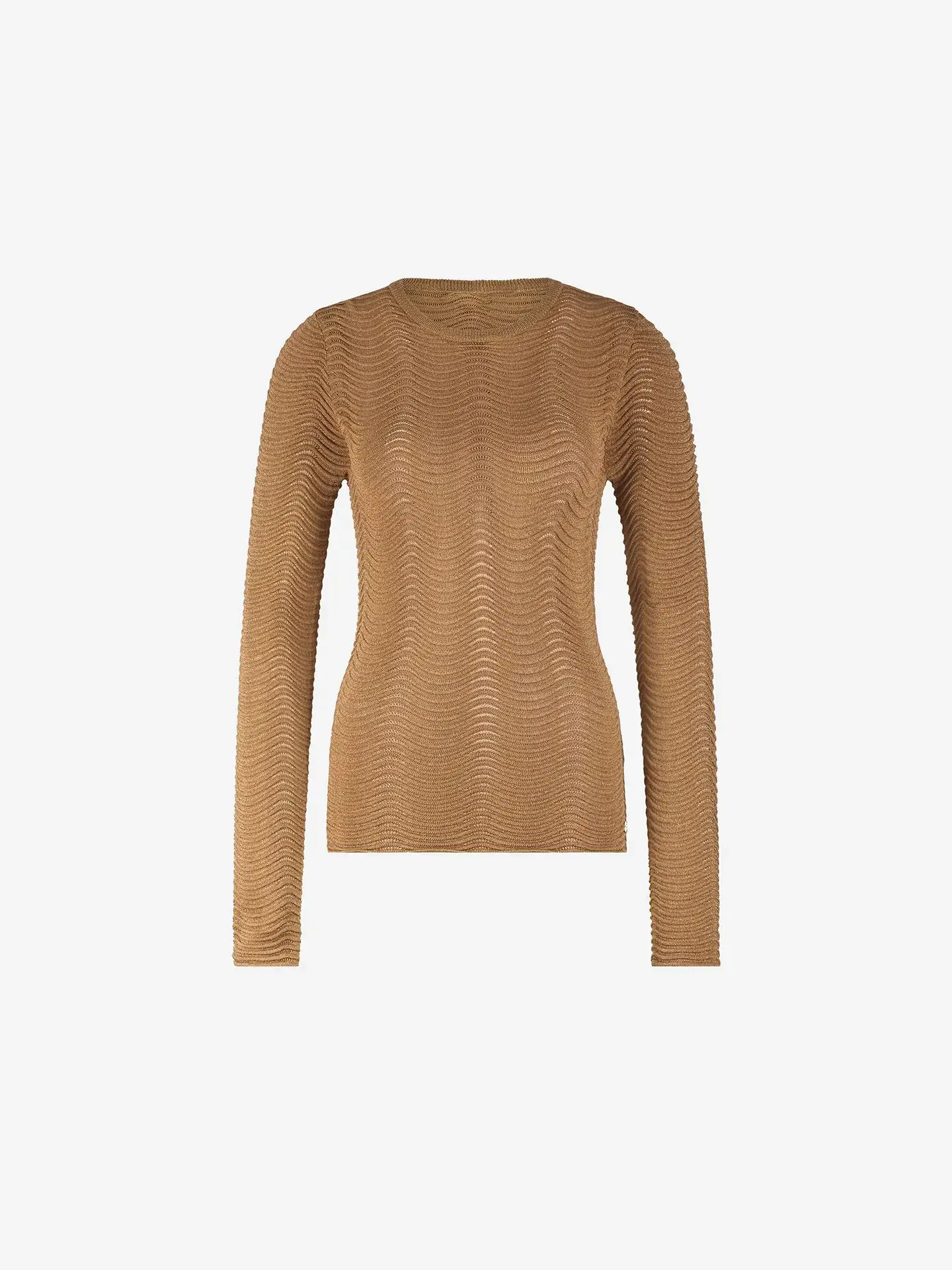 Aansluitende top met een golvend patroon, een ronde hals en een subtiel glitterdraad.In Black,Coffee en Cream
