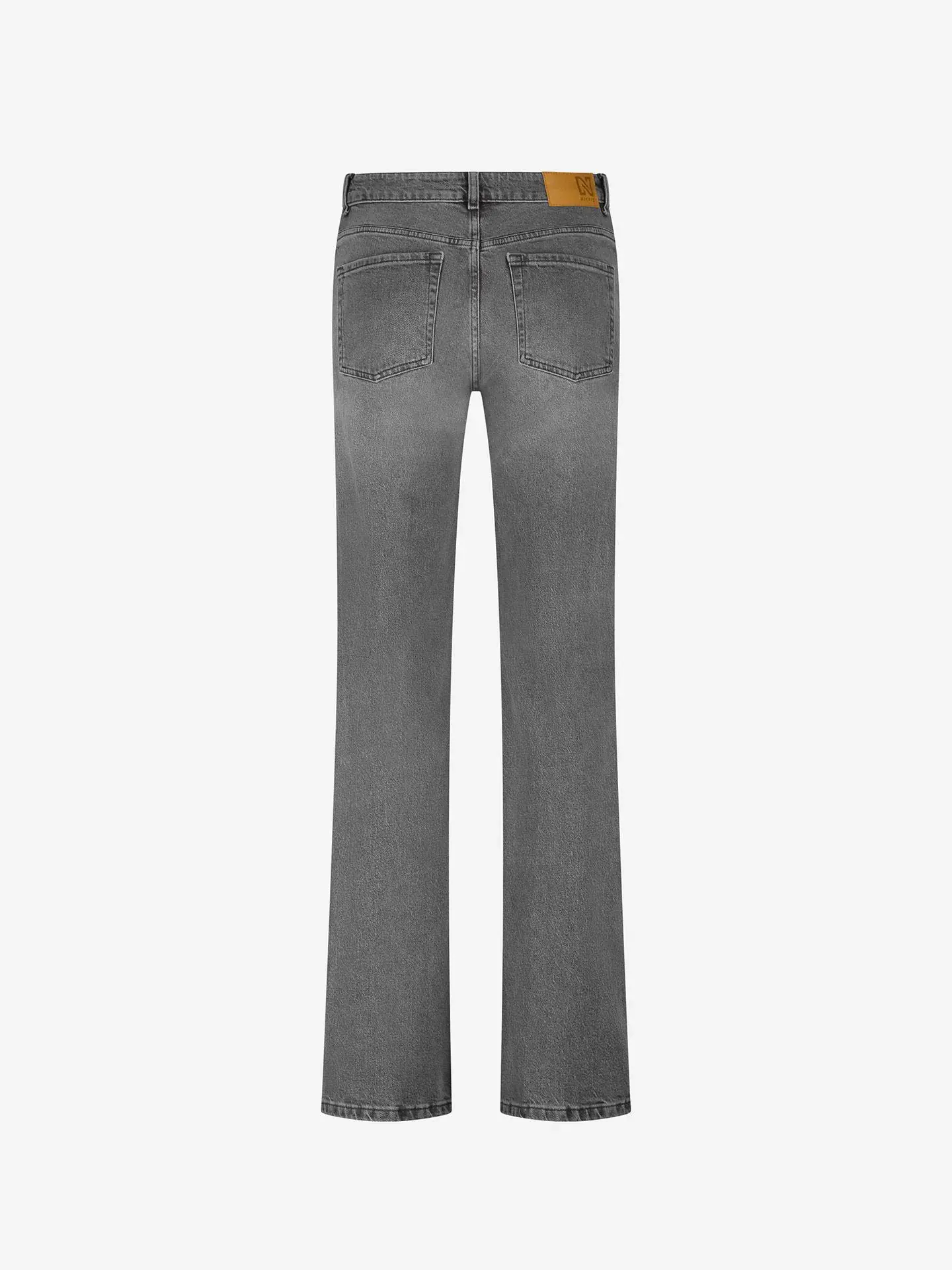 Basic jeans met een hoge taille, een rits- en knoopsluitingen en een ketting detail. De jeans is voorzien van zakken en wijde pijpen.